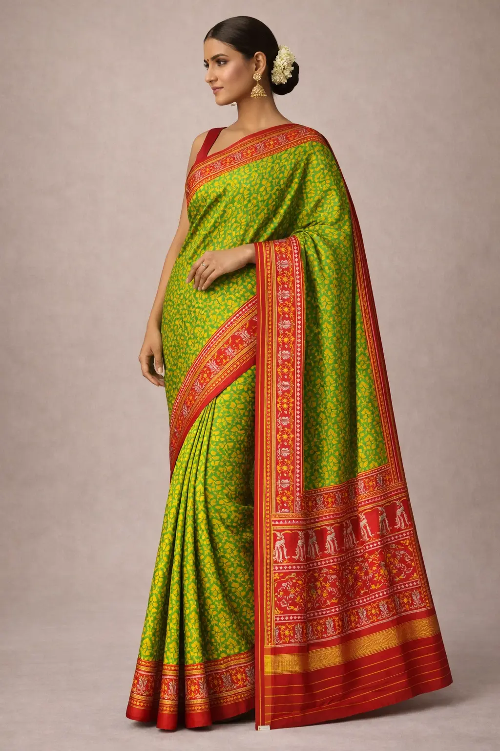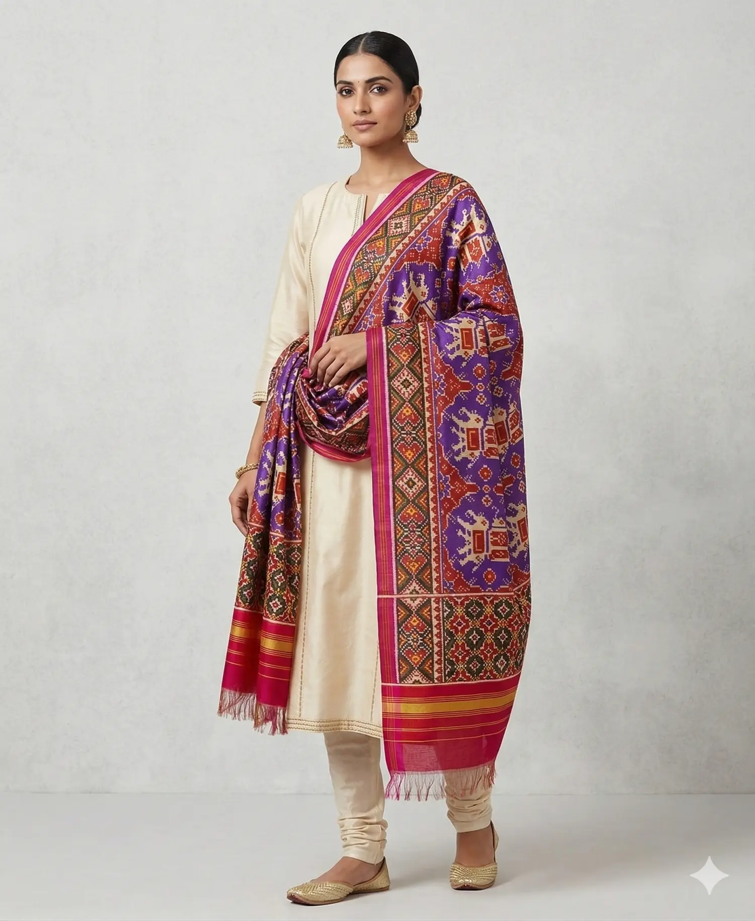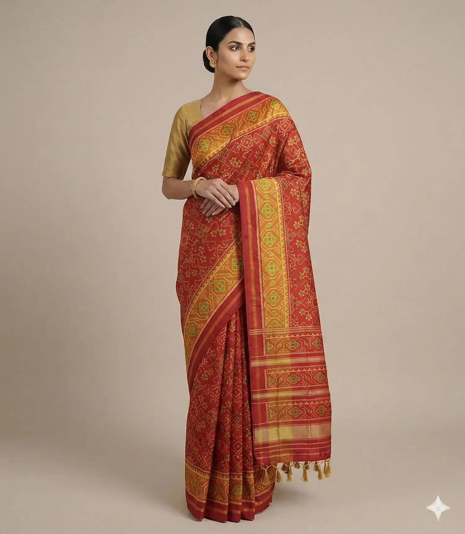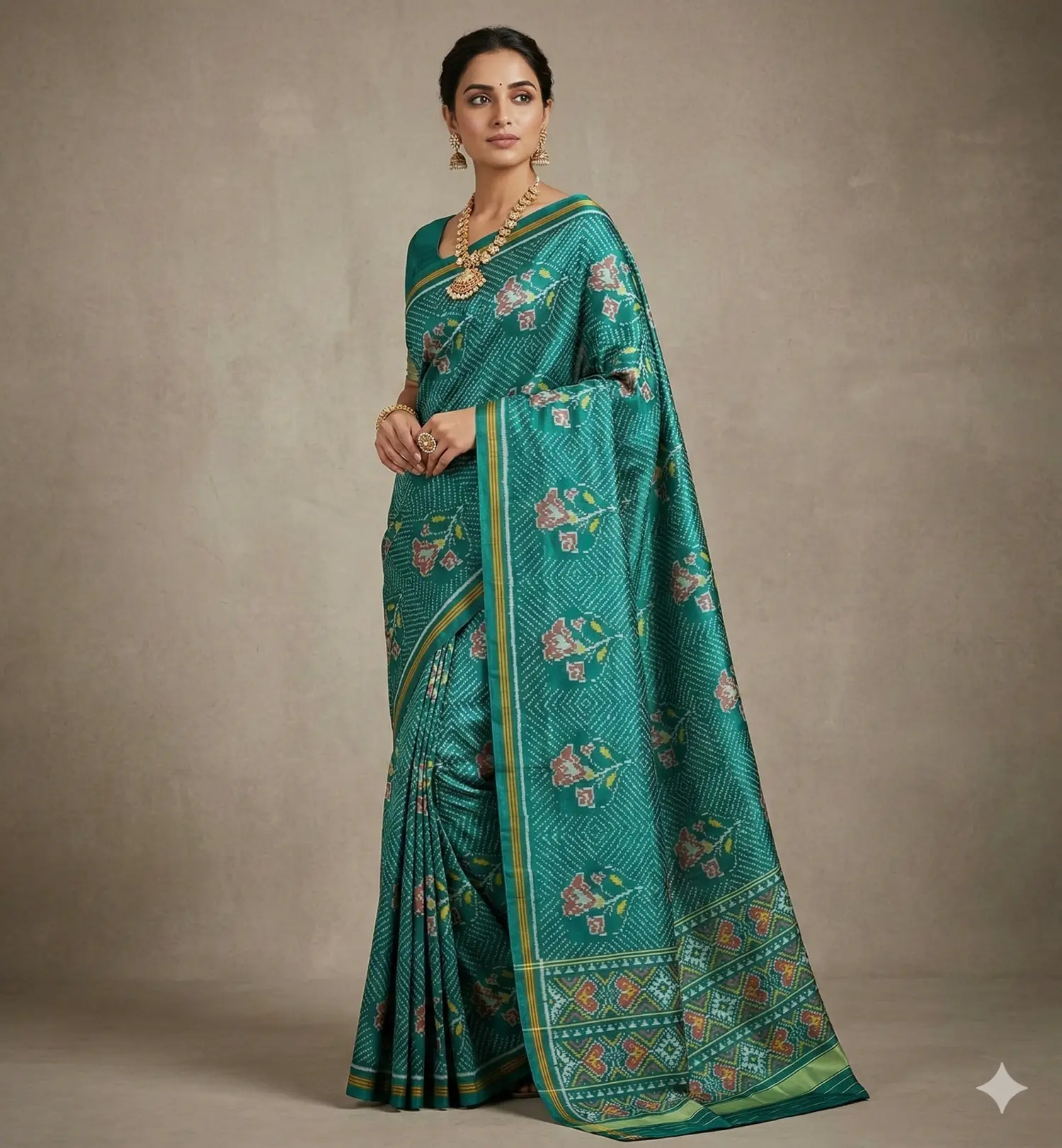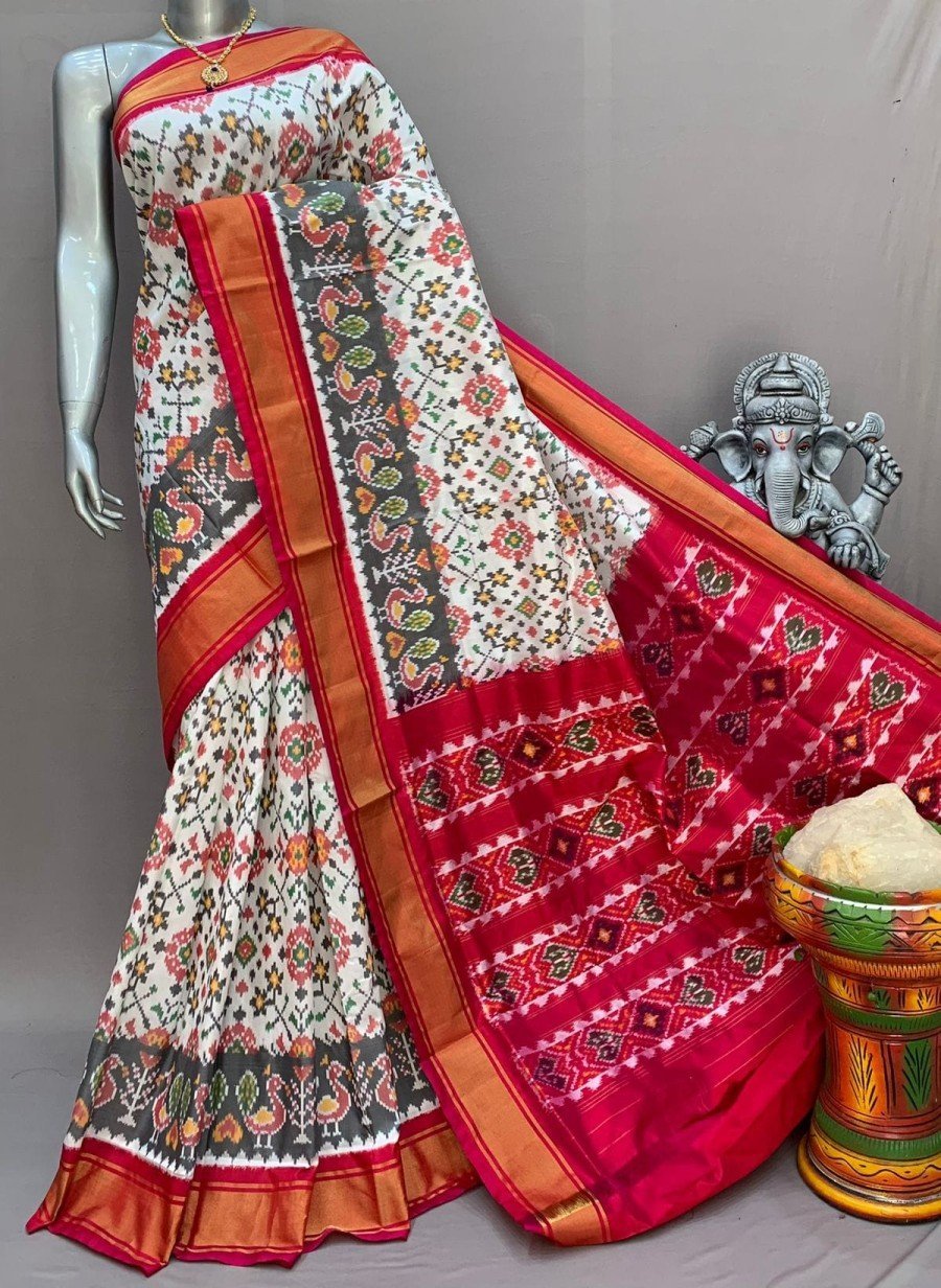 Kajal Patola is a traditional and vibrant style of Patola saree popular in Vadodara, Gujarat, known for its rich colors and intricate patterns. It is usually crafted using the double ikat weaving technique, making it highly detailed and luxurious. These sarees are widely worn in Vadodara during weddings and festive occasions. Kajal Patola designs typically include floral, geometric, and traditional motifs reflecting Gujarati heritage. They represent elegance, culture, and the timeless beauty of Indian handloom art.